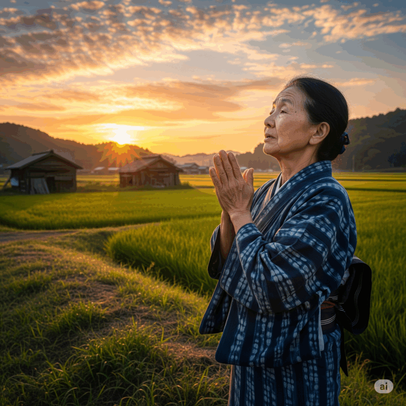 朝日が昇ってくる頃には、あたりを見渡すとお百姓さんが野良仕事をやっている風景がありました。また、お日様に手を合わせて拝んでいるお婆さんの姿もよくみかけました。